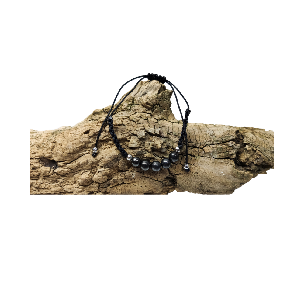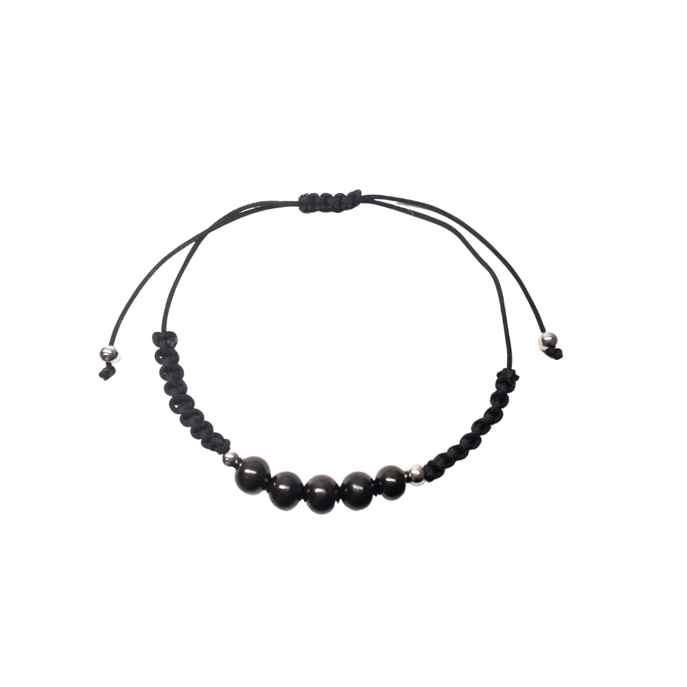 Preciosa pulsera ajustable tejida en macramé, bolas de acero y Shungit, se conoce como el mineral que lo cura todo, es uno de los más antiguos de la tierra, atrapa energías electromagnéticas, potencia el bienestar físico, absorbe el dolor, y fortalece el sistema inmunitario, contrarresta el insomnio y el estrés, favorece el metabolismo celular, calma las alergia, el asma y la fatiga.